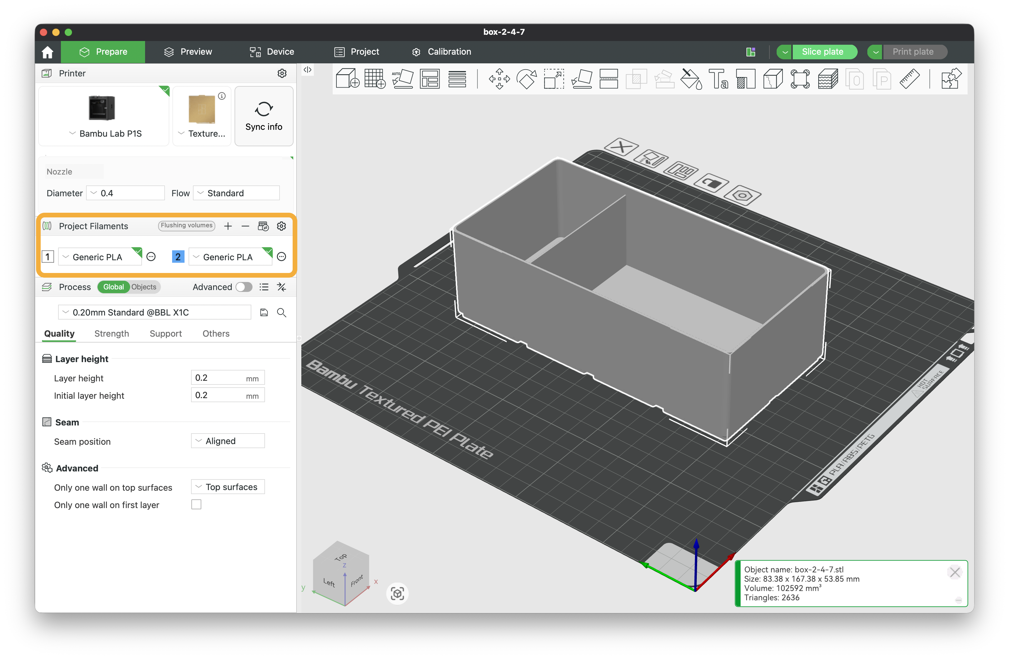 +(Add one filament) icon in theProject Filamentssidebar on the left. This step is important, otherwise, you wonât be able to assign different filaments to different parts of the model.