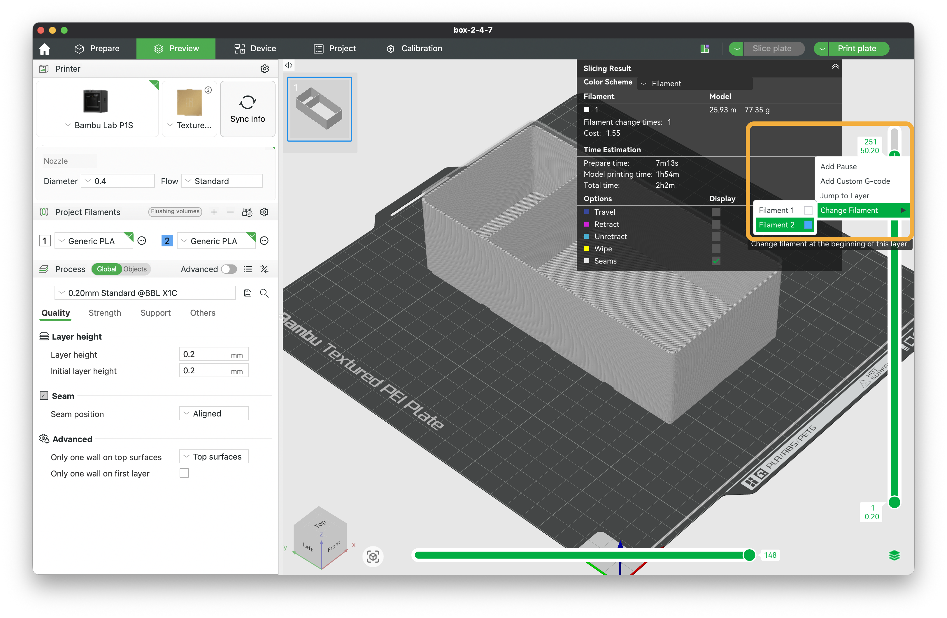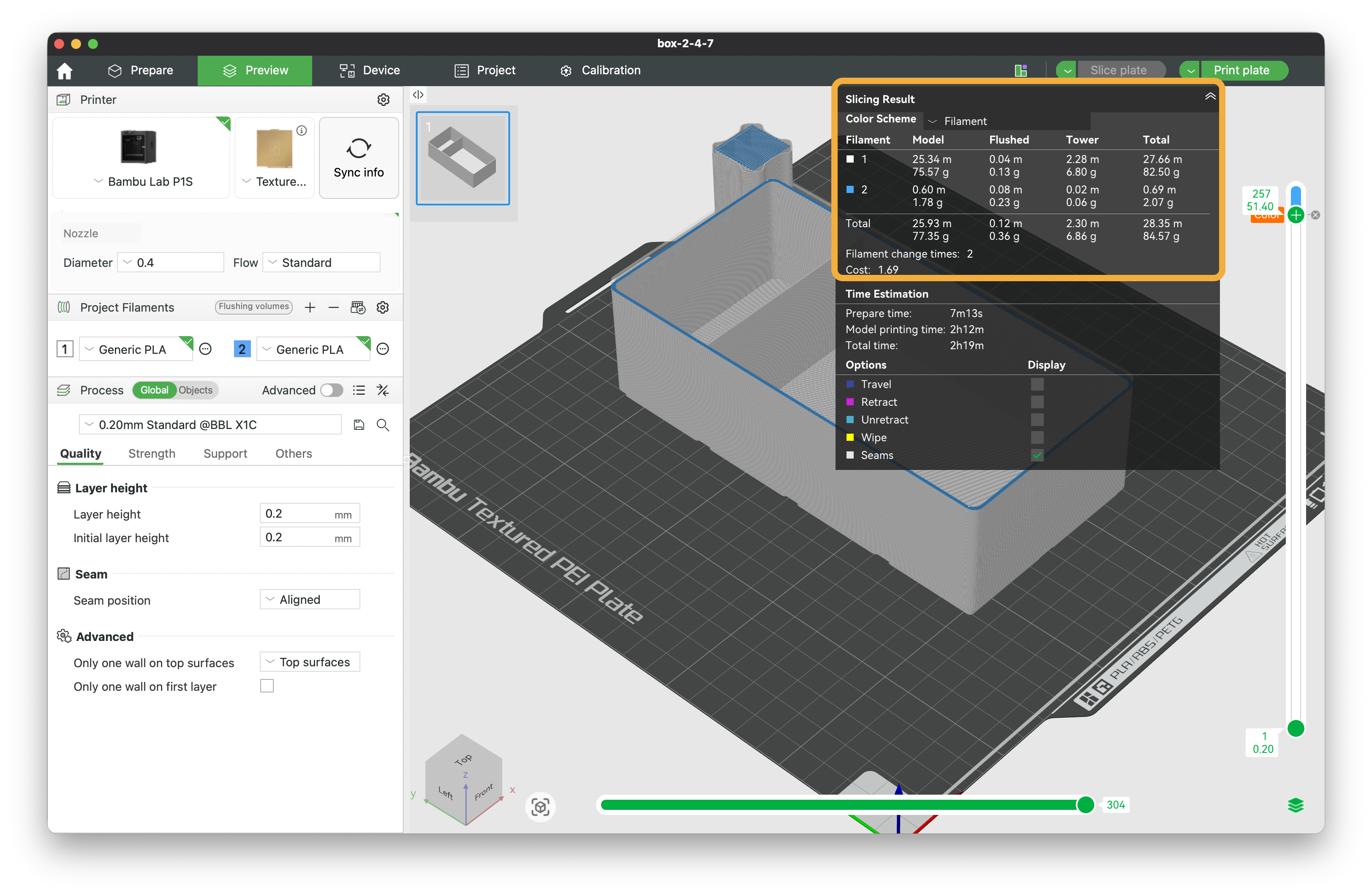 Slicing Resultsection to make sure both filaments are listed and the number of filament changes looks correct.